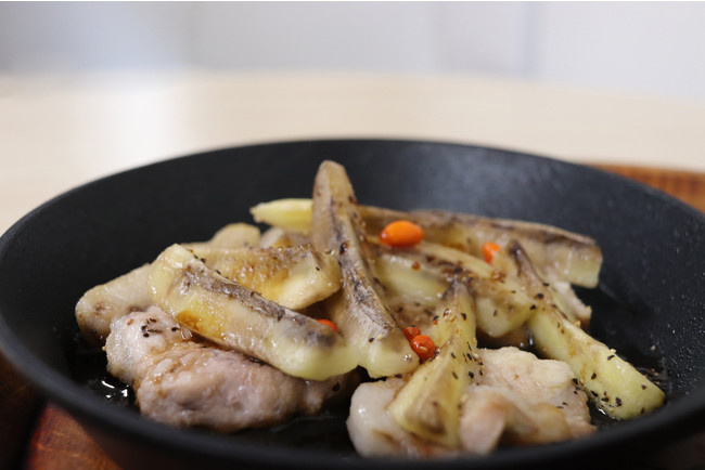 このEXの特徴的なバナナの風味を生かすレシピです。豚肉をスキレットでローストし、追いかけてバナナも載せて火を通します。頃合いに焼けたら、EXうしまどとバルサミコ酢をかけます。赤い実は枸杞の実です