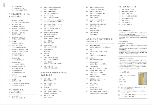 おかず、副菜(和え物または汁物)の2品献立で調理時間は約20分。コンビニにも置いてある基本の調味料とスーパーで手軽に買える食材を使って、難しいこと抜きのシンプルなレシピにこだわりました。