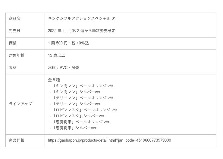 このたび、本プロジェクトの取り組みとして、シリーズ誕生から約 40 年、皆さまに愛されてきた、キン肉マン 「キンケシ(TM)」シリーズの新商品「キンケシフルアクションスペシャル 01」を 11 月第 2 週から順次、全国の玩具 売り場、量販店、家電店などに設置されたカプセル自販機にて発売します。