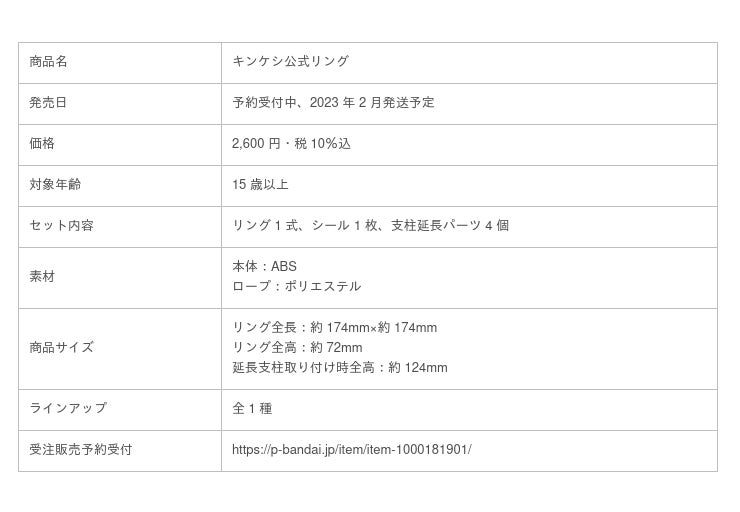 「キンケシ公式リング」は、「キンケシ(TM)」のために設計された商品で、「キンケシ(TM)」を飾るのに最適な仕様とな っています。ロープ部分にはゴム素材を採用し、延長支柱を使用することでリングを積み重ねることも可能となっていま す。5 台積み重ねて、悪魔騎士編で登場した“死の五重リング”を再現することもできます。マットを彩る専用シールも付 属しており、リアルな質感で『キン肉マン』の世界をお楽しみいただける商品です。