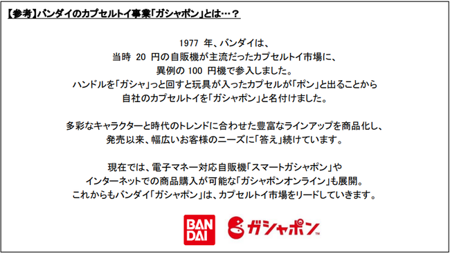 株式会社バンダイ ベンダー事業部(本社:東京都台東区)が「ガシャポン」のブランドで展開しているカプセルト イ事業は、皆さまに支えられ、2022 年で 45 周年を迎えました。現在、ガシャポン 45 周年プロジェクト「答えはガシャポンだ」を展開しています。