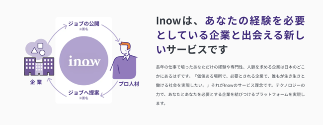 その中でも、「Inow」は、25年以上の経験を持つベテラン人材の持つ経験や専門性、人脈やノウハウと、人手不足に悩む企業とをマッチングするサービスであり、労働人口の減少、少子高齢化といった日本が抱える社会課題を、テクノロジーによって解決すべく挑戦している、極めて社会性の高いサービスでもあります。そんな「Inow」が、人手不足に悩む企業さまを少しでもサポートできれば幸いです。