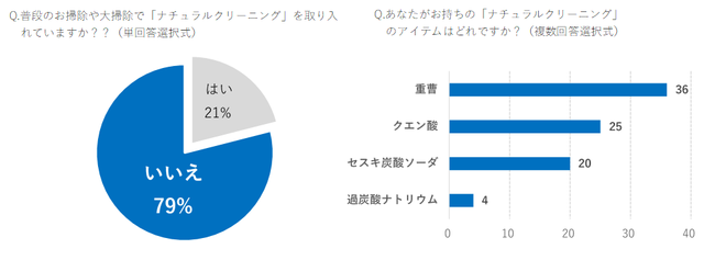 SDGsへの取り組みが進む昨今、自然由来の天然成分を使った掃除方法「ナチュラルクリーニング」が注目を集めています。ナチュラルクリーニングは、人や環境にも優しいだけでなく、1つのアイテムで複数の箇所の掃除をすることができて経済的です。調査(*1)の中で、ナチュラルクリーニングを掃除の中に取り入れているかを尋ねたところ、約8割の人がいいえと回答しており、まだまだ取り入れている人は少ないようです。ナチュラルクリーニングで使用する主なアイテムとして、重曹、クエン酸、セスキ炭酸ソーダ、過炭酸ナトリウムがありますが、ナチュラルクリーニングを取り入れていると答えた人(n=42)に、お持ちのアイテムを尋ねたところ、1位が重曹、2位がクエン酸でした。