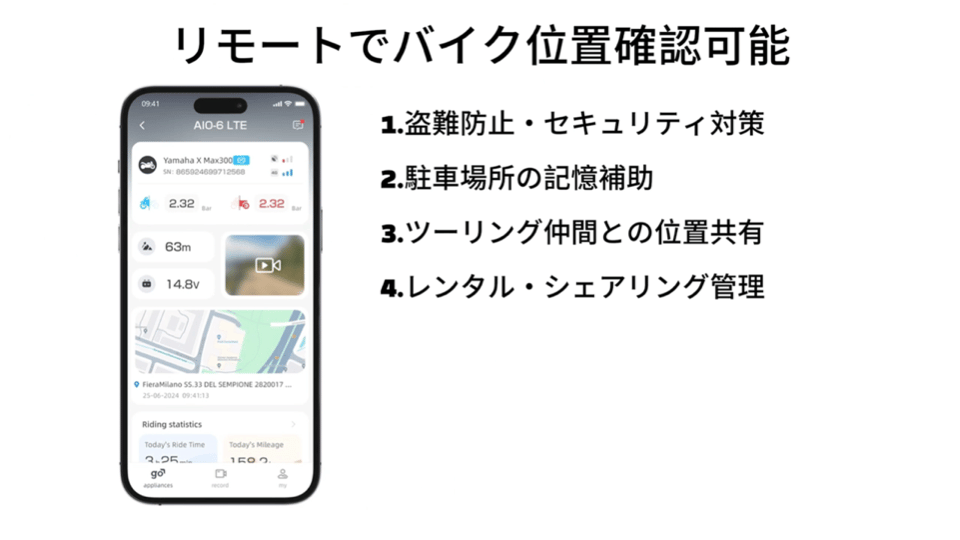 バイクの現在位置をリアルタイムで確認できるだけでなく、遠隔で搭載カメラからバイク周辺の状況を確認することが可能です。愛車が離れていても、すべてがスマートフォン一つで管理できる安心感を提供します。