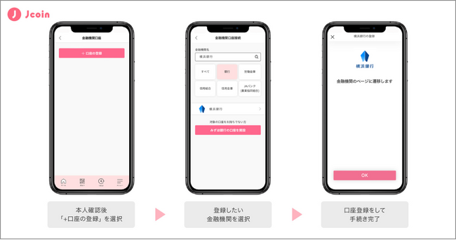 接続金融機関に預金口座をお持ちのお客さまは、『J-Coin Pay』のアプリをダウンロードしていただき、登録したい金融機関を選択、口座番号等の必要情報を入力し、本人確認を行うことで、預金口座と『J-Coin Pay』を接続することができます。