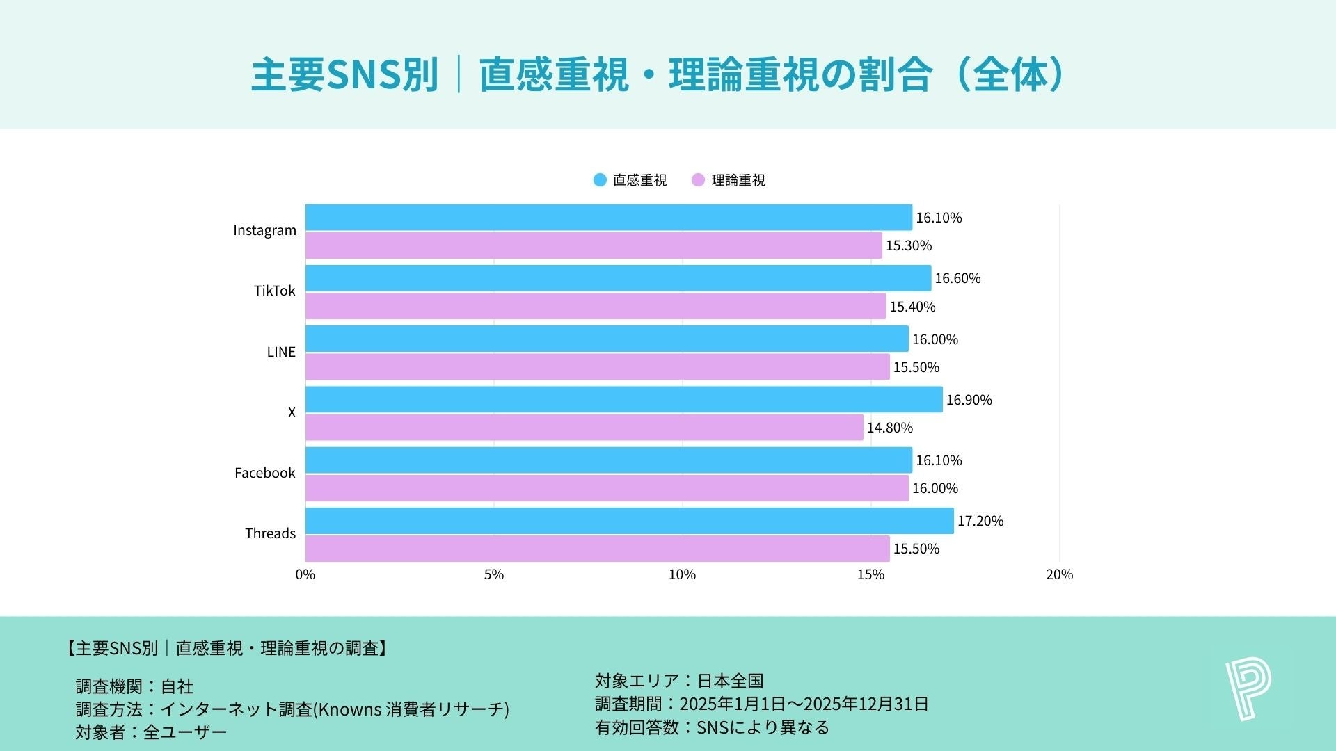 1.【全体傾向】主要SNSでは「直感派・理論派」が拮抗、全体は15〜17%台で横並び