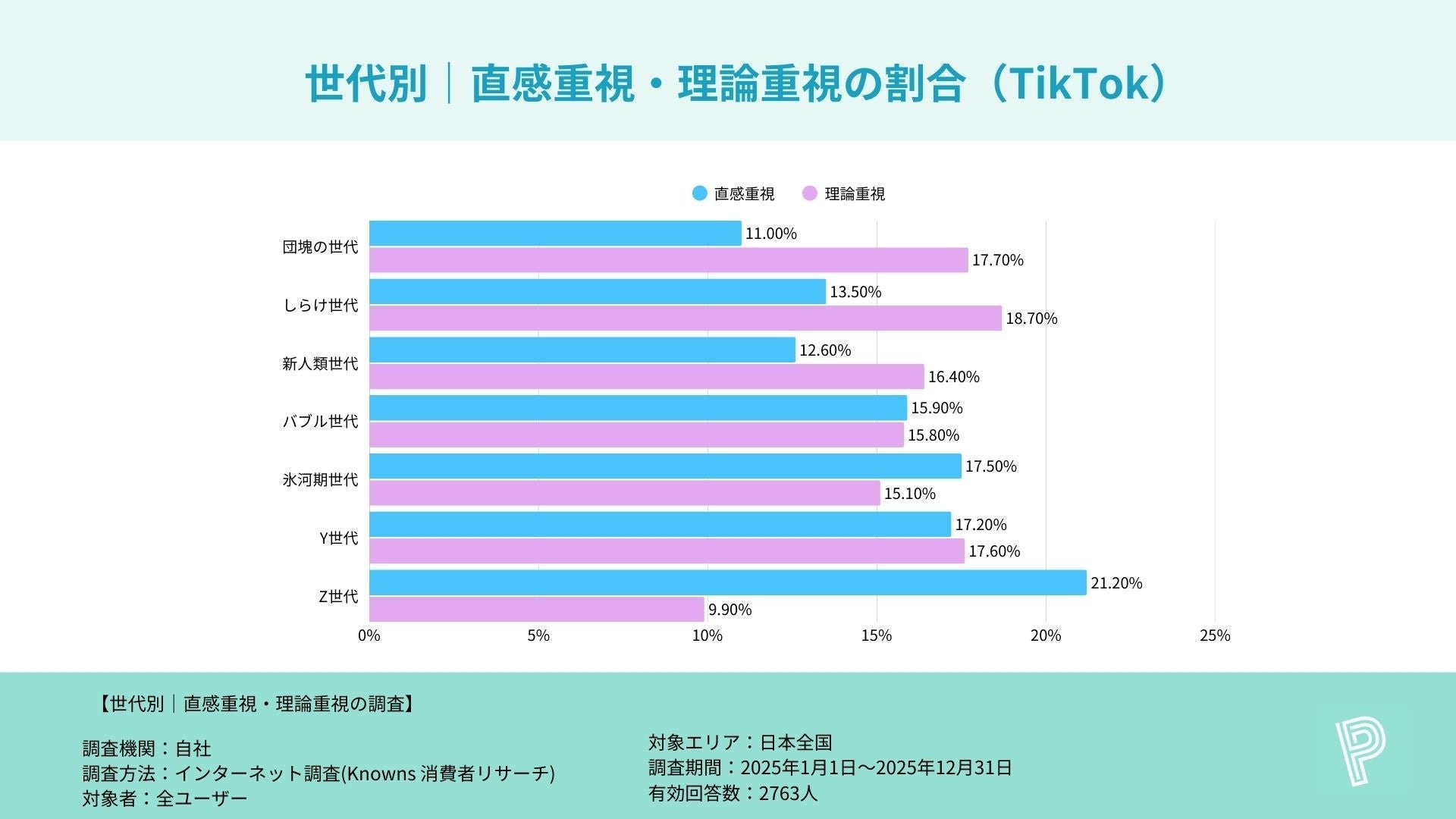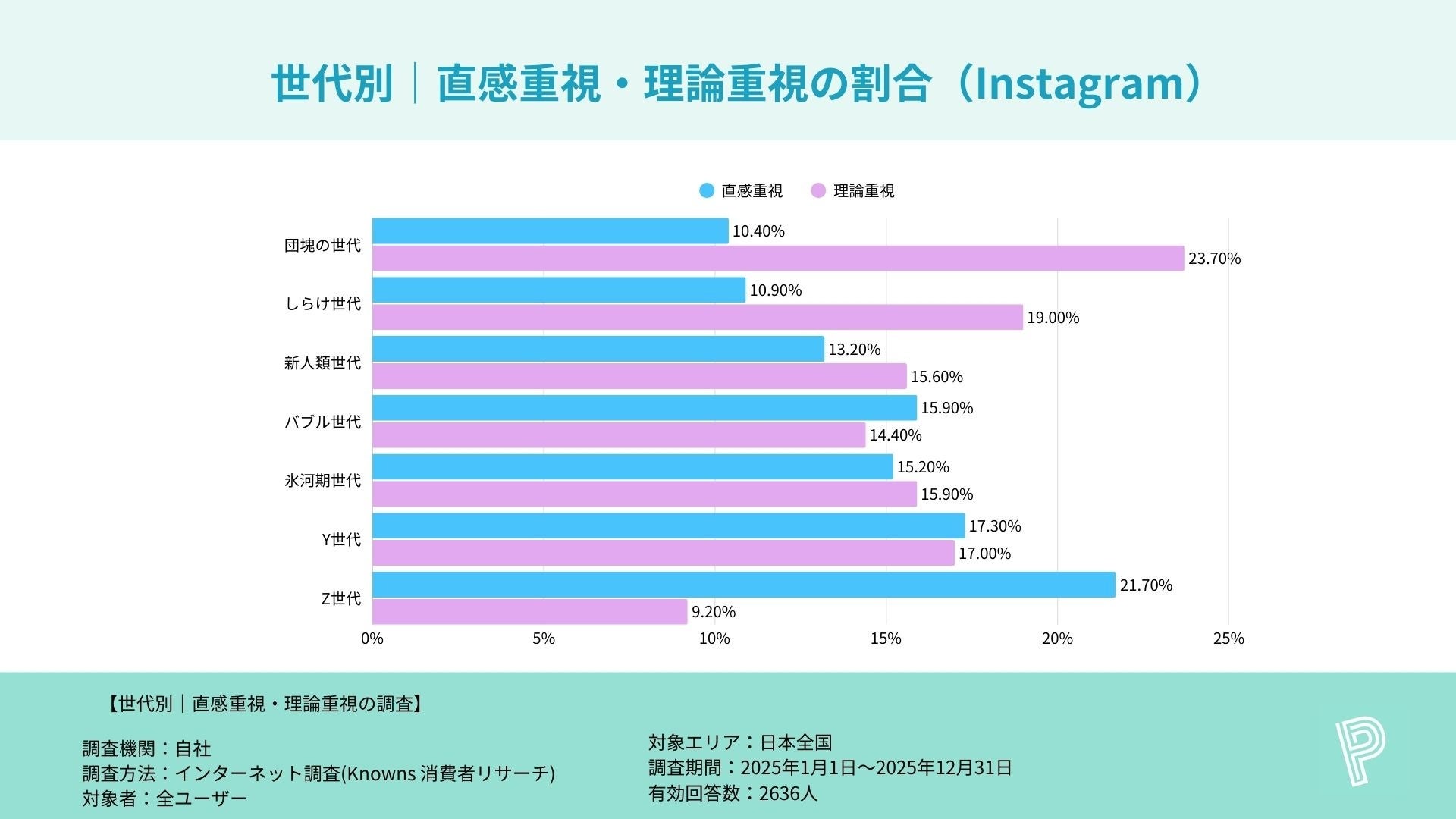 ・Z世代の“理論重視”は1桁台が目立ち、X(7.9%)・Instagram(9.2%)など、直感派との差が大きい結果に