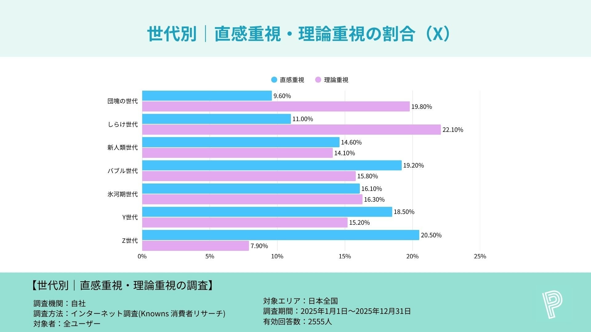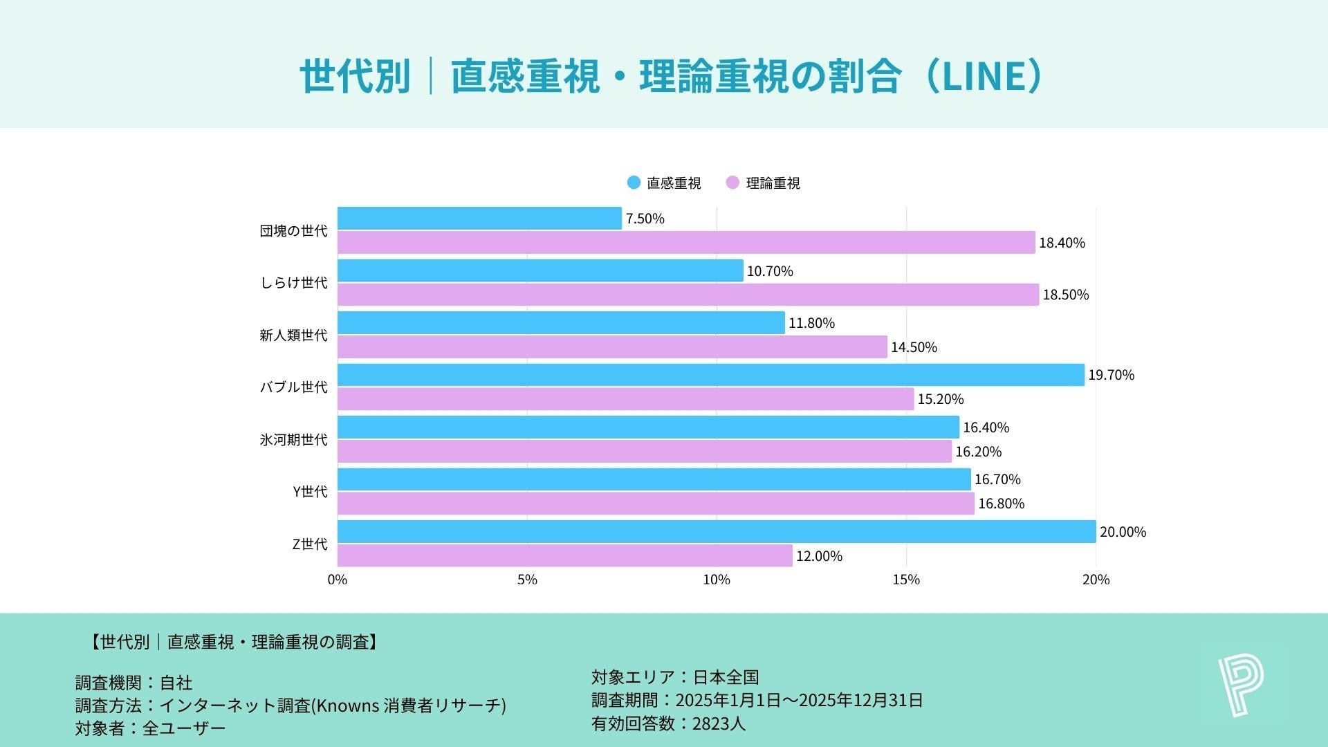 SNS別に世代傾向を整理すると、Threadsは全体でも直感重視17.2%・理論重視15.5%と極端な偏りが小さく、世代によって“直感・理論のバランスが変化しやすい媒体”といえます。LINEは全体では直感重視16.0%・理論重視15.5%と拮抗しつつ、バブル世代のみ直感重視19.7%と伸びが見られました。Xは全体で直感重視が16.9%と高い一方、しらけ世代では理論重視22.1%が突出するなど、同じSNSでも世代ごとに“使い方・意思決定スタイル”が異なることが示されています。