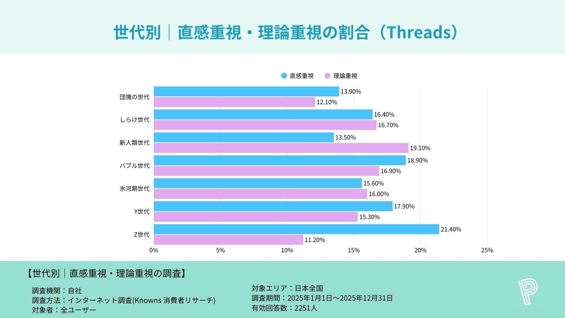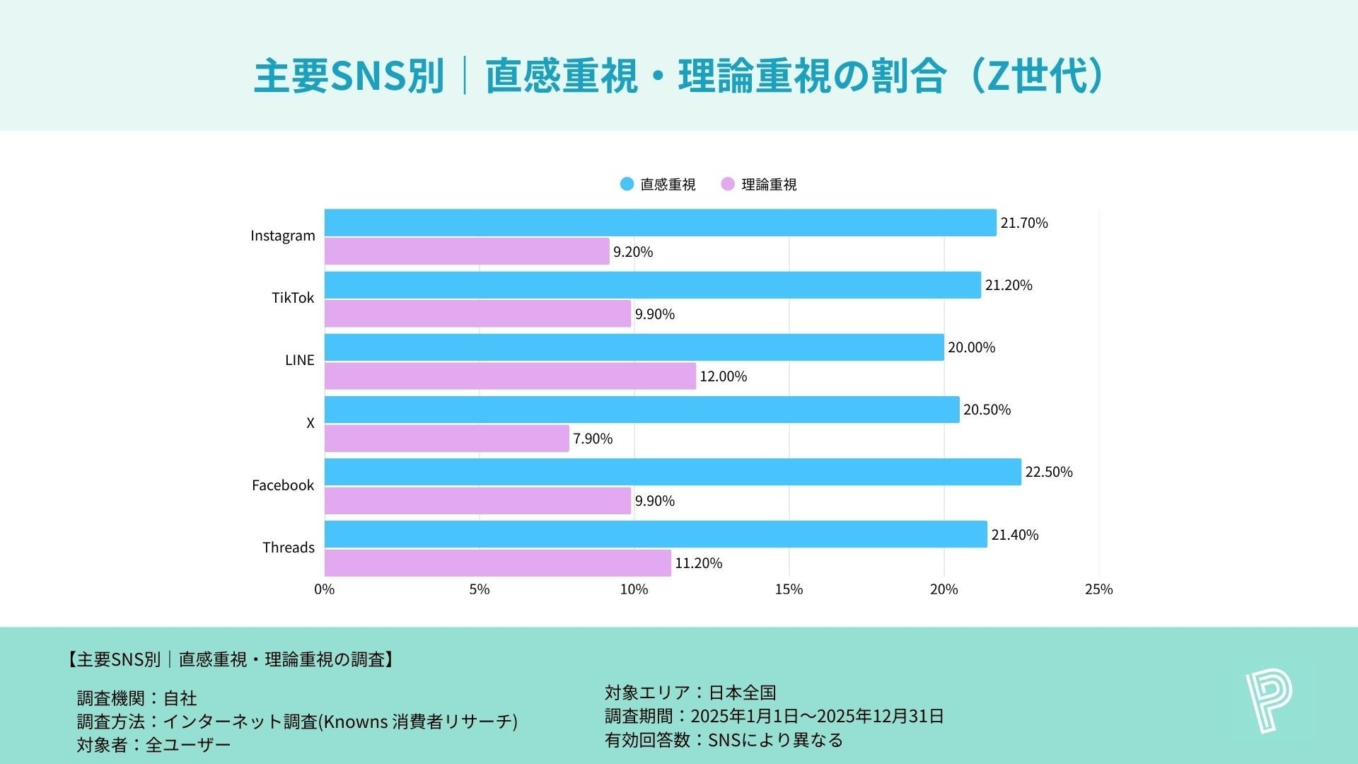 ・Z世代は全SNSで“直感重視”が20%超となり、特にFacebook(22.5%)・Instagram(21.7%)・Threads(21.4%)で高い傾向