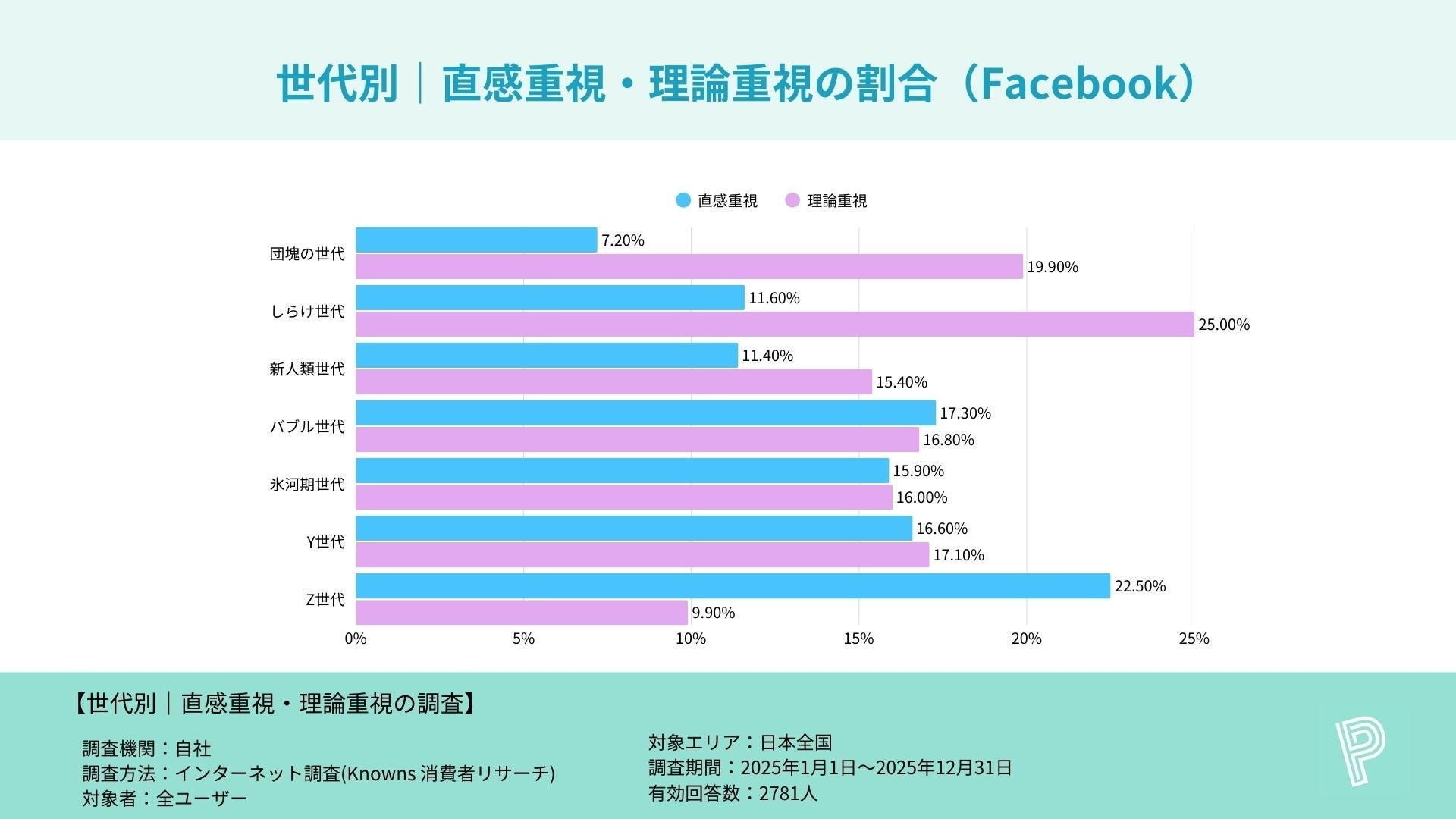 ・団塊・しらけ世代では“理論重視”が優勢で、Facebook(しらけ25.0%)・X(しらけ22.1%)・Instagram(団塊23.7%)などで顕著