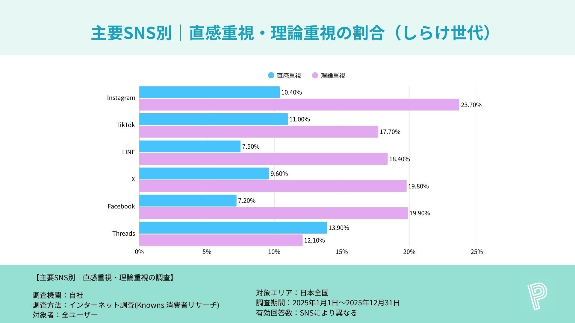 一方で理論重視はFacebookが16.0%と最も高く、直感・理論どちらかに極端に偏るというより、SNS全体では“直感も理論も同程度に存在する”構図が見られます。
