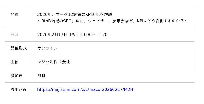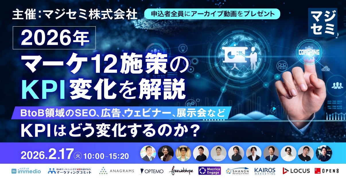 “次の一手”がデータでわかるMA+SFA一体型ツール「Kairos3(カイロススリー)」を提供するカイロスマーケティング株式会社(本社:東京都渋谷区、代表取締役:佐宗 大介、以下「当社」)は、マジセミ株式会社が主催するオンラインセミナー「2026年、マーケ12施策のKPI変化を解説〜BtoB領域のSEO、広告、ウェビナー、展示会など、KPIはどう変化するのか?〜」に、当社取締役 COO 白井 則行が登壇することをお知らせします。