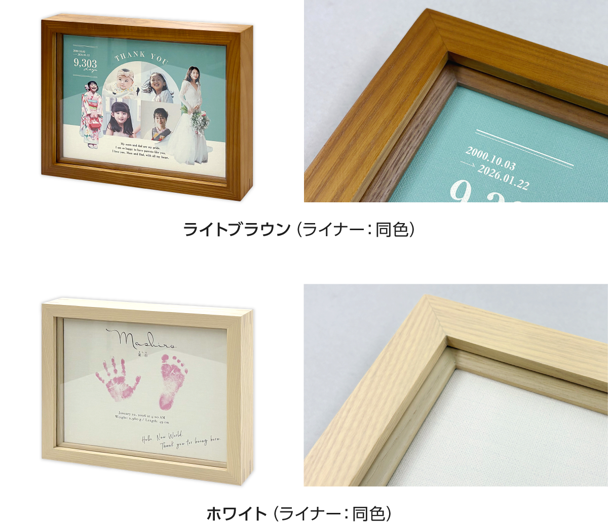 また、カラーは「木製 油彩額」でライトブラウンとホワイト、「樹脂製 油彩額」でブラックとホワイトの全4種類をご用意しております。
