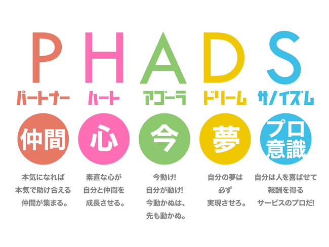 社名のPHAD‘Sは、Partner(仲間)、Heart(心)、Agora(今 [ポルトガル語])、Dream(夢)、サノイズム(プロ意識)の5つの頭文字から名付けられました。