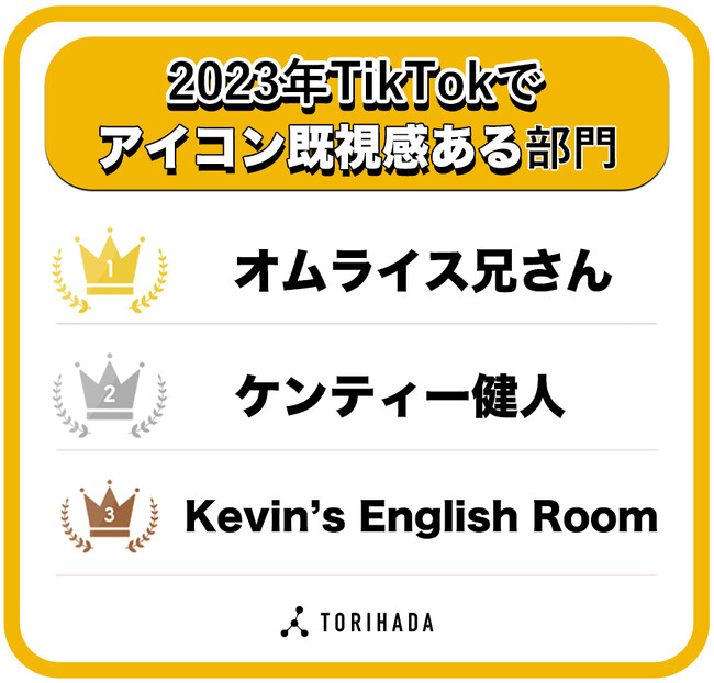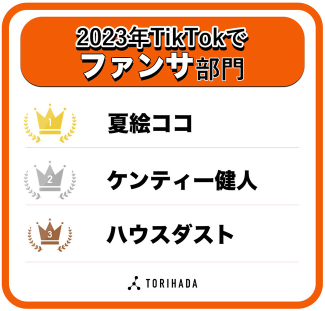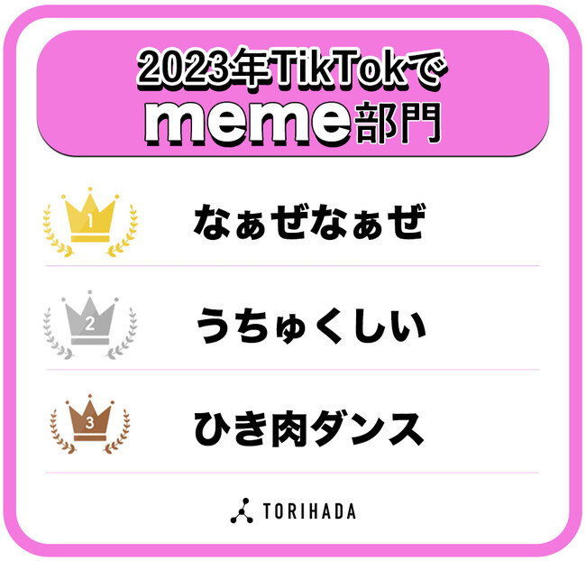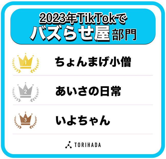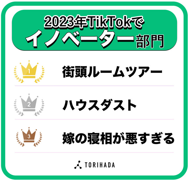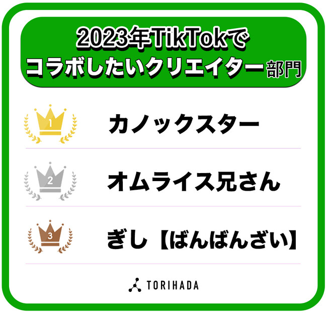 株式会社TORIHADA(本社:東京都渋谷区、代表取締役社長:若井 映亮)及びTORIHADAの100%子会社であるPPP STUDIO株式会社は、「TikTokクリエイターが選ぶ!!流行ランキング2023」を発表いたします。