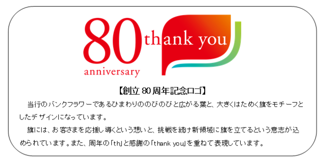 当行はこの節目の年に、ステークホルダーの皆さまに感謝の気持ちをお伝えするため、下記の通り創立80周年記念事業を実施します。