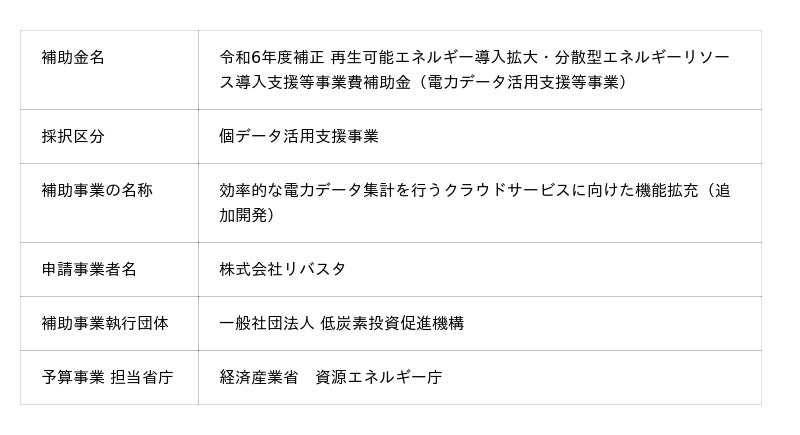 株式会社リバスタ(本社:東京都江東区、代表取締役:高橋巧、以下 当社)は、経済産業省から交付される補助金事業の執行等を担う、一般社団法人 低炭素投資促進機構(以下 GIO)の「令和6年度補正 再生可能エネルギー導入拡大・分散型エネルギーリソース導入支援等事業費補助金(電力データ活用支援等事業)(※1)」(以下 本事業)において、当社の申請内容が「個データ活用支援事業」として採択され、補助金の交付が決定されたことをお知らせします。