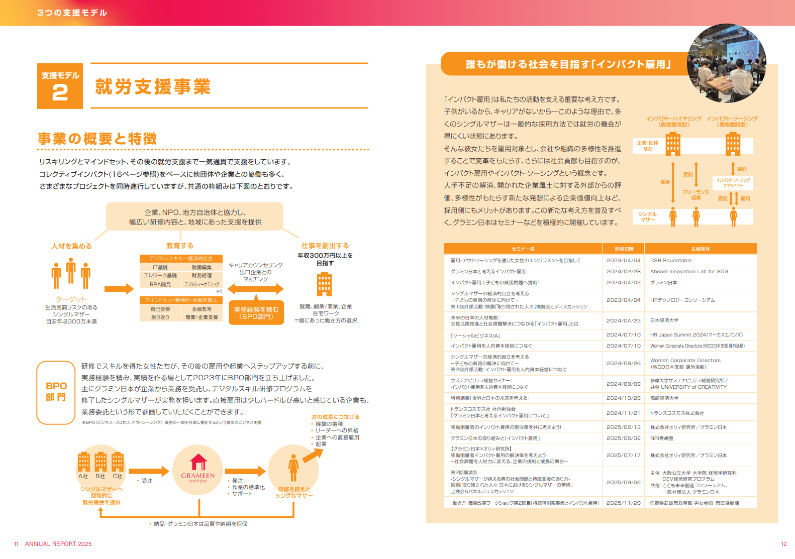 起業や就労支援を通じてシングルマザーの経済的自立を推進する、一般財団法人グラミン日本(本社:東京都中央区、理事長:百野公裕、以下「グラミン日本」)は、2025年度(第9期)の事業報告書を発行いたしました。