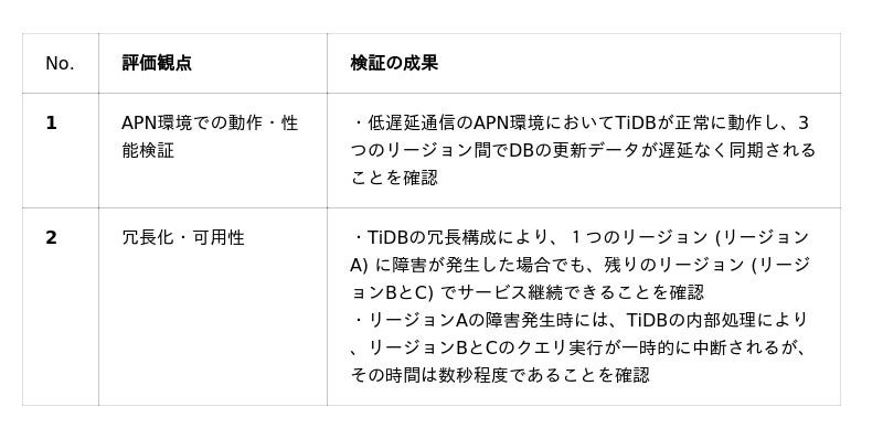 今回の検証では、APNを利用し、70km圏内の接続を想定した2つの仮想DCと3つのリージョン(区域)を構築してデータ分散処理の動作が検証されました。仮想DCに置く分散型データベース(DB)としてオープンソースの「TiDB」が採用された背景には、以下のようなTiDBの特長が挙げられます。