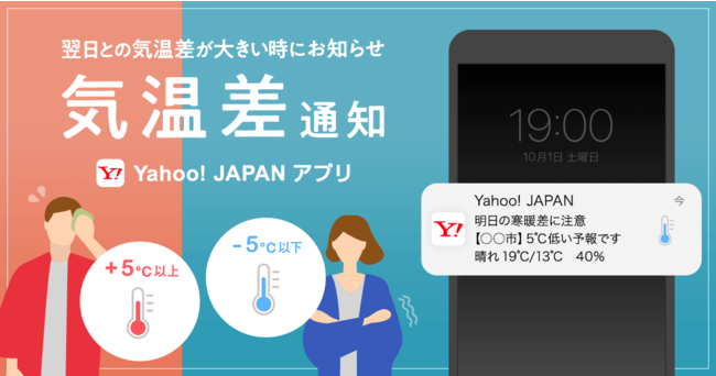 ヤフー株式会社(以下、Yahoo! JAPAN)が提供する「Yahoo! JAPAN」アプリ(iOS版、Android版)は、ユーザーが設定した地域の翌日の最高・最低気温が5℃以上の差があると予想された際に、プッシュ通知でお知らせする機能「気温差通知」(以下、本機能)の提供を開始しています。