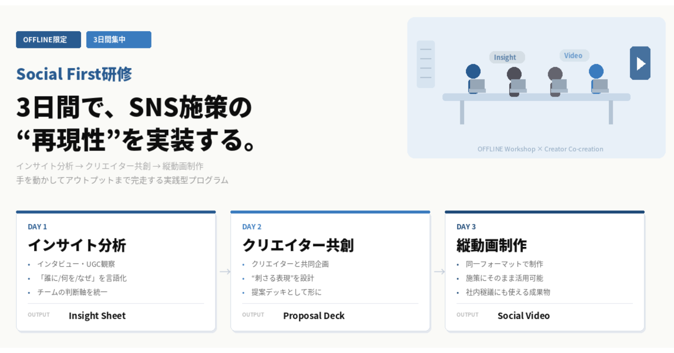 単なる座学ではなく、実際に手と頭を動かしながらアウトプットまで完走することで、成果につながる思考プロセスと制作工程を組織内に定着させ、SNS施策の再現性向上を実現します。