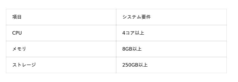 コンテナ(Container)技術を基盤とした軽量なアーキテクチャを採用しており、ハードウェアリソースへの負荷を最小限に抑える設計となっています。軽量な環境での導入と安定稼働をサポートすることで、構築コストの削減と導入ハードルの低減に寄与します。これにより、将来のアップデートや機能拡張の継続性を維持しつつ、長期的な安定稼働を確保します。導入効率を高める推奨システム要件は下表の通りです。