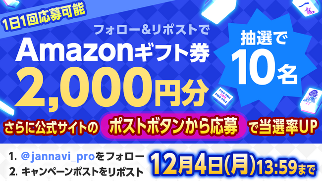 2023年11月24日(金)より12月4日(月)までオンライン麻雀アプリ「ジャンナビ麻雀オンライン」X(Twitter)公式アカウントにて抽選でamazonギフト券2000円分を10名様にプレゼントするキャンペーンを実施致します。