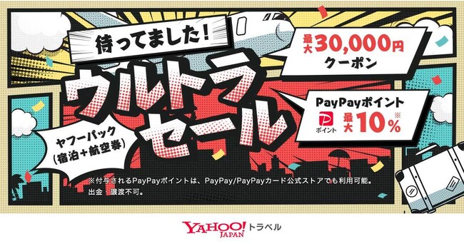 LINEヤフー株式会社(以下、LINEヤフー)が提供するインターネット旅行予約サービス「Yahoo!トラベル」は本日より、宿泊と航空券がセットでお得な「ヤフーパック」で、人気の宿泊施設が期間限定でお得になる「ヤフーパックウルトラセール」を開始しました。また、JAL・ANA便限定の割引クーポンの配布やPayPayポイントのポイントアップキャンペーンもあわせて実施します。