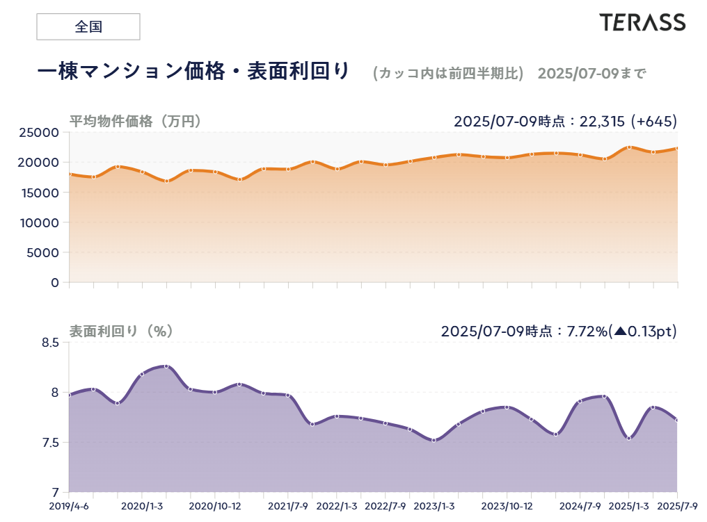 一棟マンションの価格は、ゆるやかな上昇を続けている。2025年1-3月期に過去5年間の最高となったが4-6月期・7-9月期は微増減。