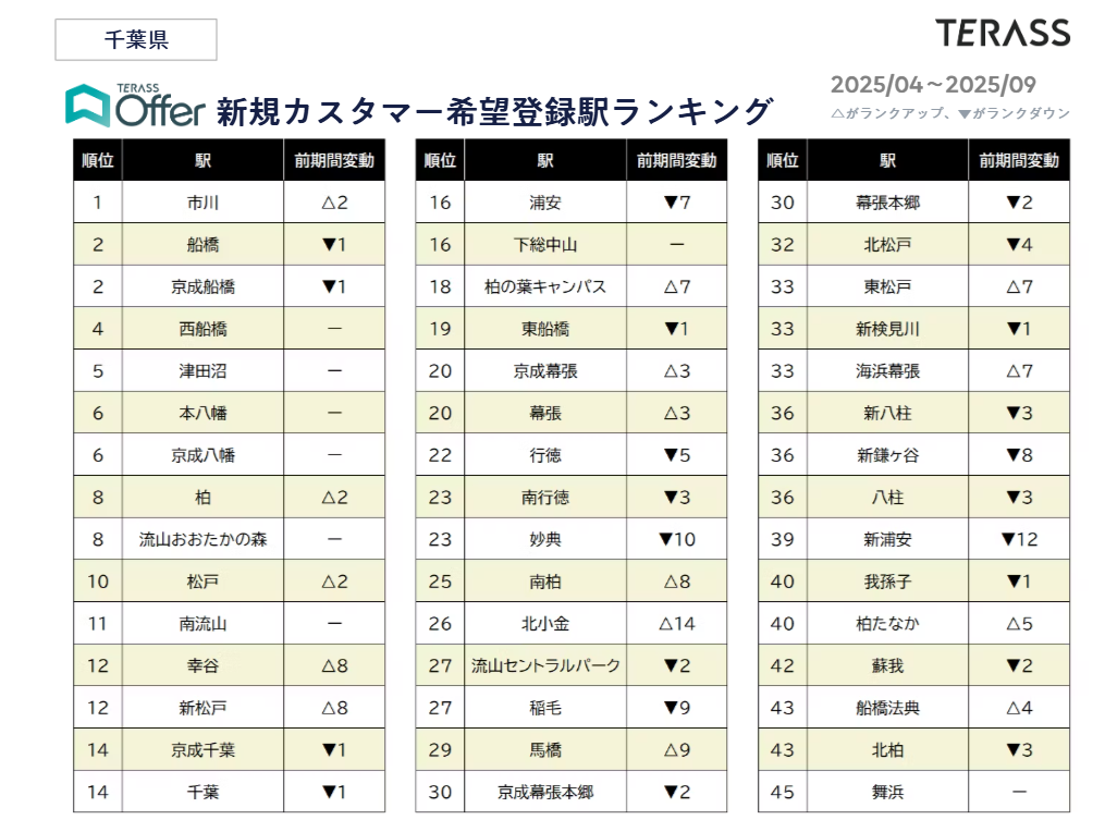 前期3位の市川が1位を獲得。船橋・京成船橋も含めたトップ3や6位までの上位エリアは変わらず。