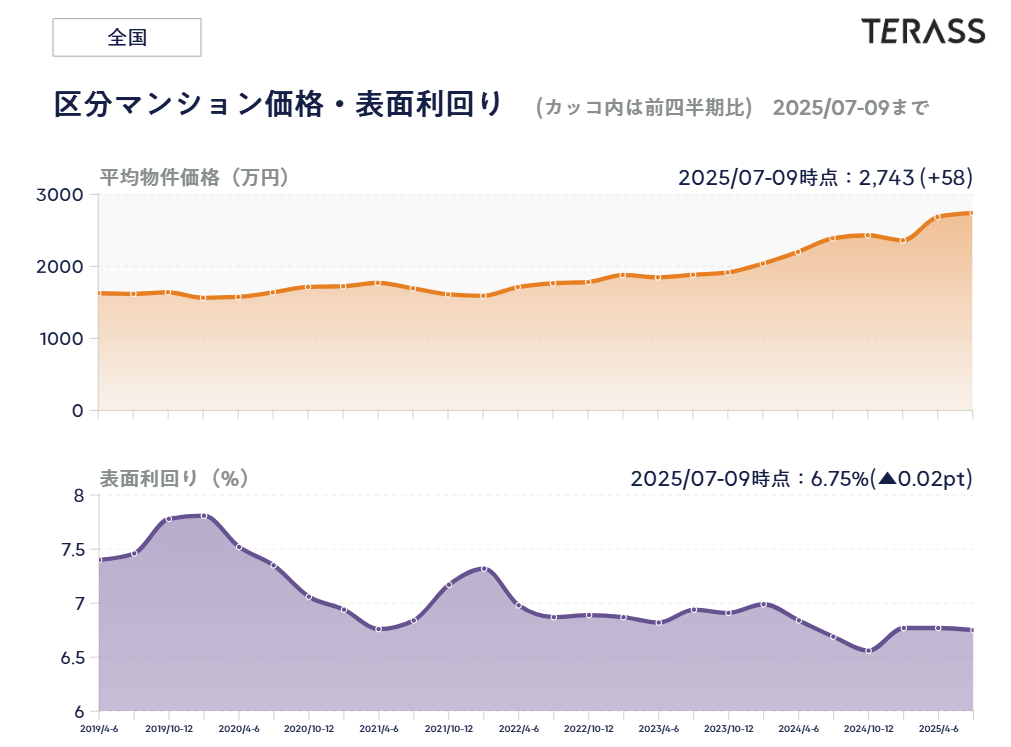 表面利回りは、賃料の値上がりから2023年以降上昇傾向にあり、直近2025年4-6月期は10%を突破。7-9月期は▲0.73pt低下し再び9%台へ。