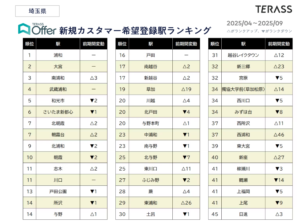 前期3位の和光市がランクダウンし、南浦和が3ポイント上昇してトップ3入り。