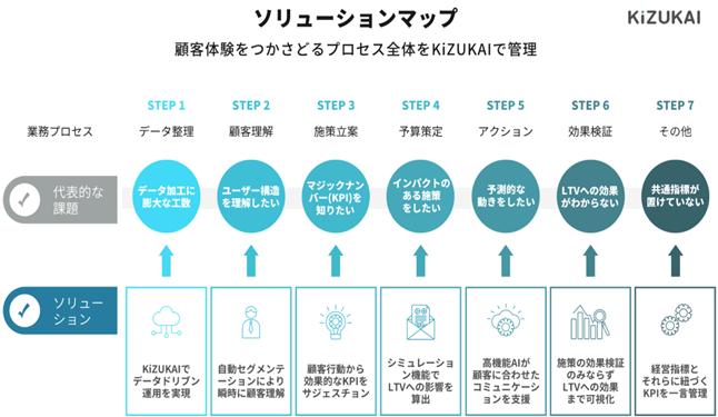 「KiZUKAI」は、顧客体験をつかさどるプロセス全体を管理し、収益に繋げる施策運用を実現するクラウドツールです。