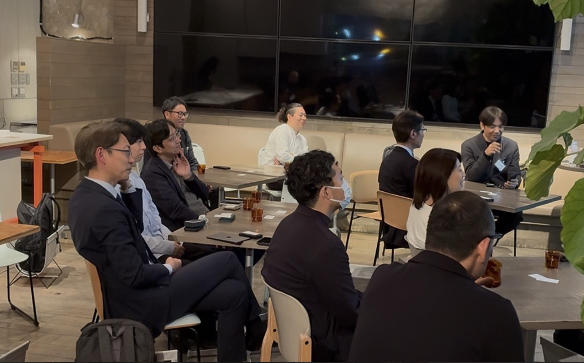 本セミナー後に、参加者全員で、飲食をしながら懇親会を実施。左下画像:ミイダスが提案する「人的資本経営ゲーム」を実際に活用するカードを見ながら内容を説明