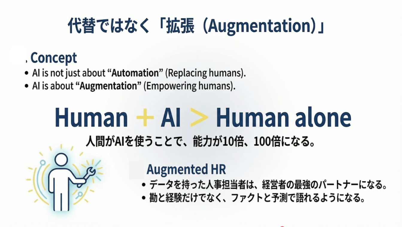 永島氏は、今後は「代替」ではなく「拡張」を前提に、人とAIの役割を再定義していくことが、組織変革の鍵になると述べました。