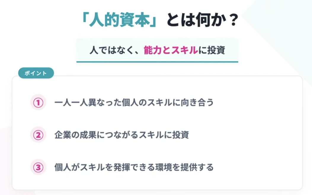 また、「人的資本」とは、社員個人が有する能力、スキル、知識、経験であり、これが企業の経済的成果に直結するものとして捉えることが重要です。そして、「人的資本経営」とは、単なる開示対応や流行語ではなく、人的資本投資により人的資本を最大化し、中長期的に企業価値の向上を目指す経営手法であると説明されました。