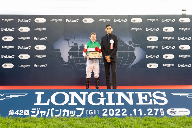 ブランド創業190年を迎えたスイスの時計ブランド『ロンジン』がオフィシャルパートナー兼タイムキーパーを務めた「ロンジン賞 第42回ジャパンカップ 」が、2022年11月27日(日)に東京競馬場にて開催されました。沸き返る大観衆の中、一着でゴールしたヴェラアズールを称え、ロンジン ヴァイスプレジデント マチュー・バウムガートナーと、ロンジンのアンバサダーであるUTA氏が、ヴェラアズールの馬主・調教師・騎手ら関係者6名にロンジンの腕時計を贈呈いたしました。