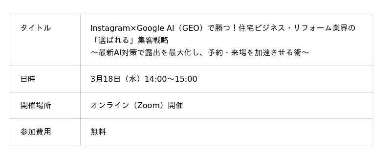 3月18日(水)Instagram×Google AI(GEO)で勝つ!住宅ビジネス・リフォーム業界の「選ばれる」集客戦略 〜最新AI対策で露出を最大化し、予約・来場を加速させる術〜セミナー開催