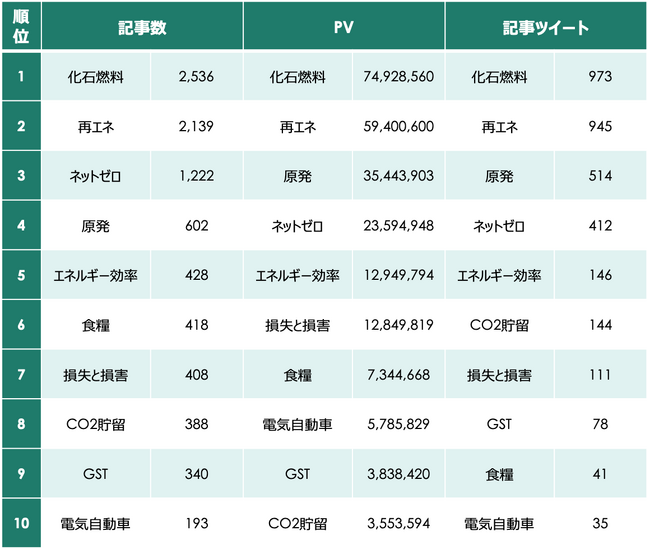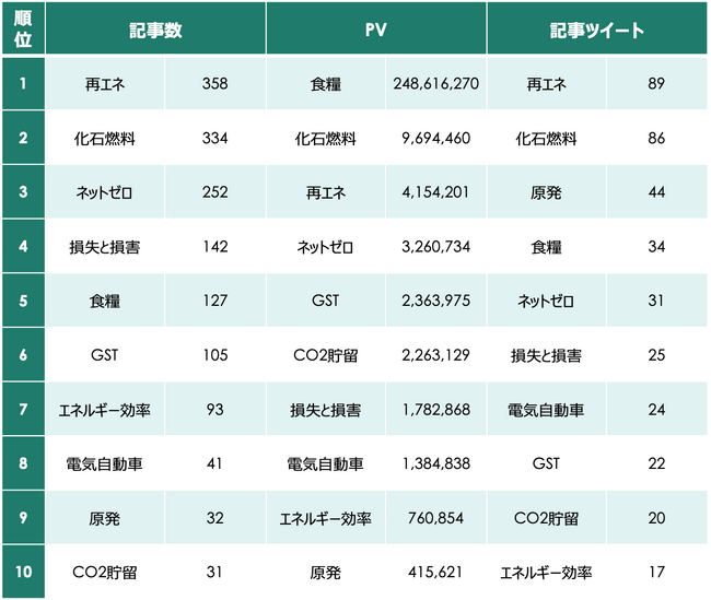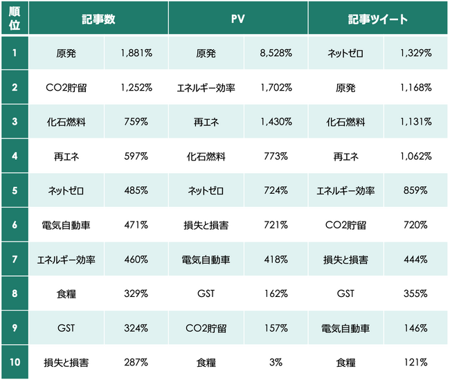 ・記事数3位は「ネットゼロ」。PV・記事ツイート3位は「原子力発電」関連。