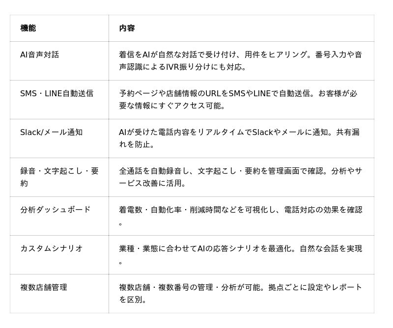 本サービスは、店舗への電話の一次受付をAIが担当することで、営業時間外や忙しい時間帯に取りこぼしていた予約や問い合わせを確実に受け付け、売上機会の損失を防ぎます。専用の050番号で着信を受けると、AIが自然な会話で用件をヒアリングし、メールやSlackで情報を共有。必要に応じてスタッフへ転送する仕組みです。月額5,000円(税別)から利用可能です。