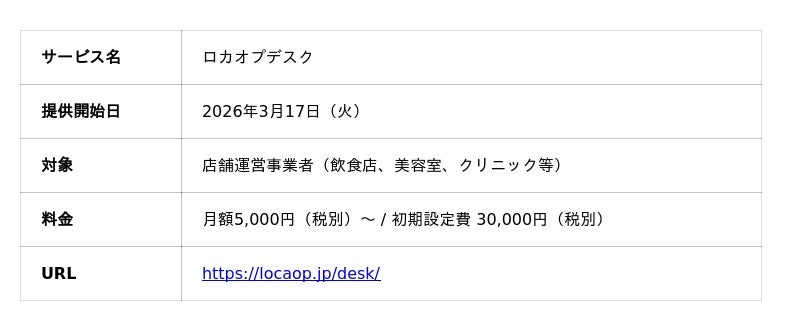 Googleマップ(MEO)対策を中心に、店舗集客や来店促進を支援するSaaSツール「ロカオプ」を提供する株式会社ロカオプ(本社:東京都新宿区新宿、代表取締役:縣将貴、以下:ロカオプ)は、2026年3月17日(火)より、店舗向けAI電話受付サービス『ロカオプデスク』を提供開始いたしました。