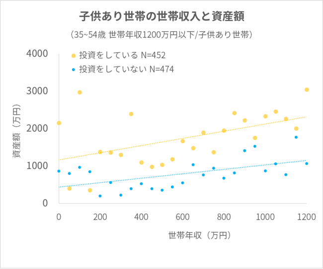 ファミリー世帯の方が、収入が増えるほど投資の有無による資産の影響を受けやすい