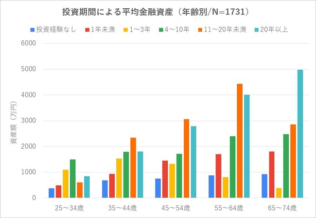 全年齢層で投資歴に応じて資産額が増えていて、年齢が上がるほどに投資をしていない人と投資を長く続けている人の差が大きくなりました。また、全ての年代において、投資歴1年未満でも投資をしていない人との資産額に差があり、投資歴20年以上の人は、年齢が上がるにつれて資産額も大きくなる傾向が強いという結果がでました。