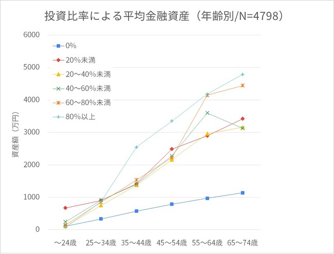 投資比率に関わらず、年齢が上がるにつれて、投資の有無による資産額の差(=「投資格差」)が大きくなっています。35歳以上になると投資の有無による資産額の差が800万円以上になり、55歳以上になると、投資の有無のみでなく、投資比率の高さも資産額の格差に影響を及ぼしてきます。