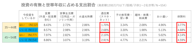 投資をしている人はしていない人に比べて年収に占める通信費と保険料の割合が低く節約志向