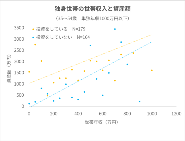 投資をしていない人に比べて、投資をしている人の方が年収と資産額の傾きが右肩上がりになっています。つまり世帯年収が上がるほど、投資の有無による資産額の差が大きくなっています。今後の収入増を見越した場合、投資をしている方が資産の構築に有利に働く可能性があります。