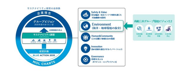 商船三井グループは、経営計画「BLUE ACTION 2035」https://www.mol.co.jp/ir/management/plan/pdf/blueaction2035.pdf において環境戦略を主要戦略の一つとして位置付けています。また「海洋・地球環境の保全」をサステナビリティ課題の一つに掲げ、その目標とアクションを示すため「商船三井グループ環境ビジョン2.2」https://www.mol.co.jp/sustainability/environment/vision/pdf/vision22/mol_group_environmental_vision_2.2.pdf?v=230428 を定めています。海洋プラスチックごみの回収をはじめとする海洋環境保全の取組みだけでなく、気候変動・生物多様性の保護といった様々な地球環境への負荷低減をグループ一丸となって進めています。人・社会・地球のサステナブルな発展に貢献し、青い海から豊かな未来をひらきます。