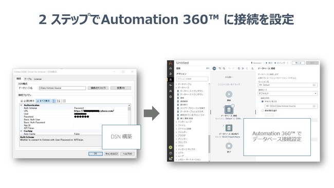 2022年3月22日、CData Software Japan 合同会社(本社:アメリカノースカロライナ州、日本オフィス:宮城県仙台市、代表社員 職務執行者 疋田 圭介、以下CData)は、オートメーション・エニウェア・ジャパン株式会社(本社:アメリカカリフォルニア州、日本オフィス:東京都港区、カントリーマネージャー 由井 希佳、以下Automation Anywhere)が提供するRPA ツール『Automation 360(TM)』とCData ODBC Drivers の連携を開始しました。Automation Anywhere でのCData ODBC Drivers の利用により、SharePoint、Dynamics 365、Marketo などのエンタープライズSaaS や、kintone、クラウドサインといった国産SaaS との連携をノーコードで構築できます。Automation Anywhere を幅広いシナリオで活用することができ、より広い業務範囲でのユーザーのオペレーション時間削減を安定的に実現します。