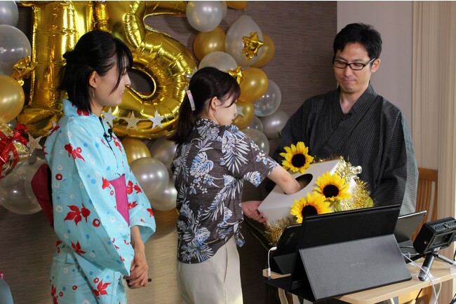 当日は、全国各地から250組を超えるオーナー様のご家族にお申込みをいただきました。今回は、フィアスホーム甲斐山梨店のモデルハウスをお借りし、夏ということで浴衣を着た本部スタッフによる司会から始まり、ひまわりのコスプレをしたフィアスホームプレジデント近藤からのご挨拶、フィアスホームの特長や甲斐山梨店のモデルハウスルームツアー、甲斐山梨店のご紹介、別会場で同日に開催していた甲斐山梨店のリアルオーナー様感謝祭と中継をつないでのお客様との交流、プレゼント大抽選会などを実施しました。さらに。全国各地のオーナー様とはチャットを活用した情報交換により、交流を図りました。