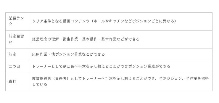 ランクアップには、テストをクリアする必要があります。例えば前座見習いのテストでは、「お客様のお出迎えとご案内」が出題され、その様子を動画で投稿レポートとして上長や本部スタッフよりお手本動画と比較したレビューコメントと合否判定が返される仕組みになっています。
